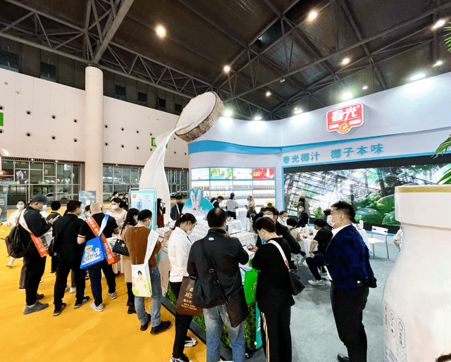 春光直接在展位上豎起了高大的椰子模型,加上傾瀉而出的奶白椰汁,極具海南風韻,數米外都能感覺到椰香撲鼻。