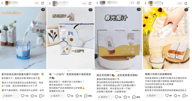 在線上的推廣中,春光多次登上頭部主播直播間,獲得廣東夫婦、東方甄選、王芳、曹穎、劉濤等眾多明星及主播信任站臺,在直播評論區中,“好喝”“椰味濃郁”“口感新鮮”“無限回購”等成為粉絲評價的高頻詞。