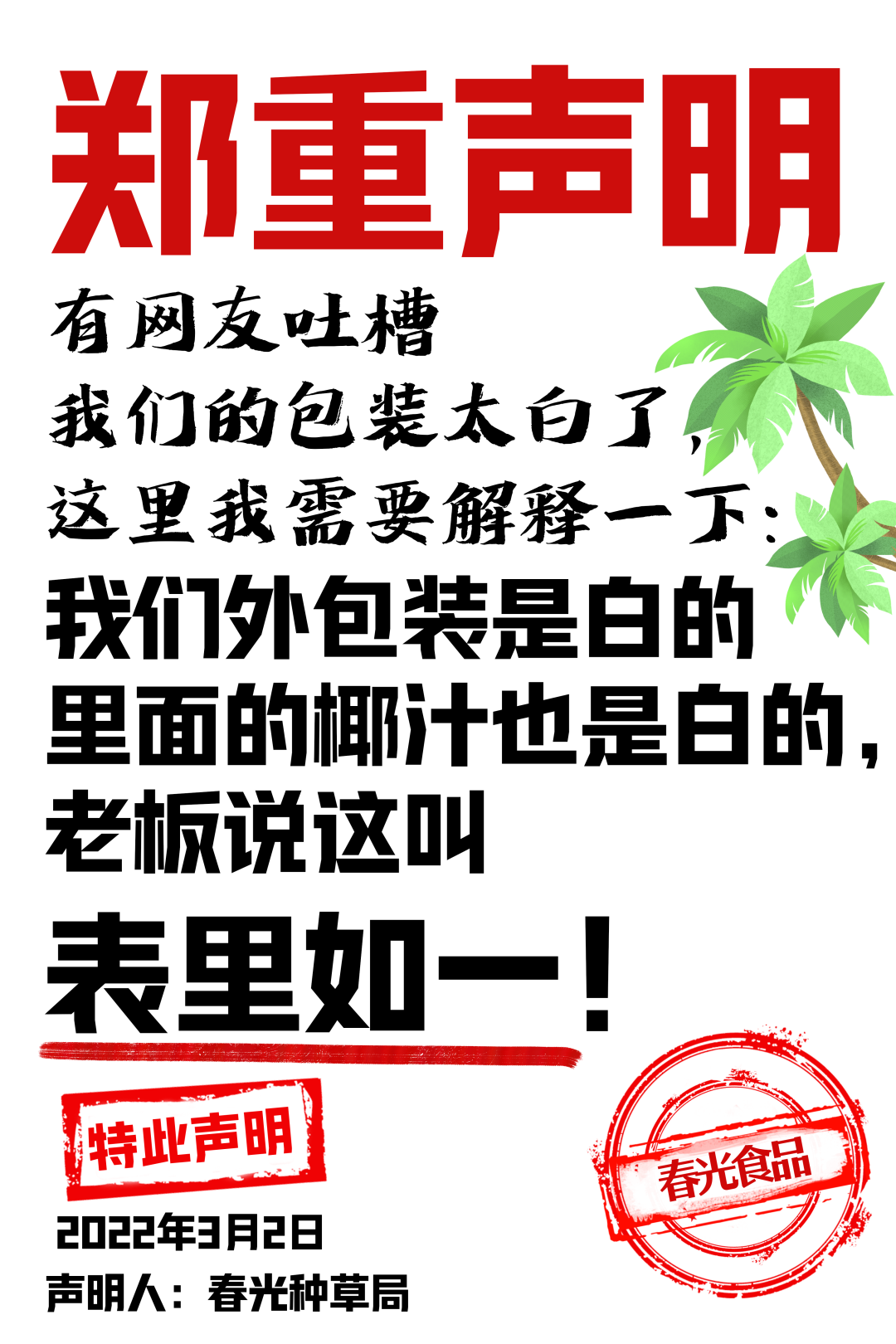 天然原料、先進工藝配上低糖配方,這些差異化舉措讓春光椰汁擁有了差異化的產品力,樹立了“新鮮”、“營養”的品牌形象,同時也體現了春光食品為廣大消費者提供一款優質椰汁的初心。